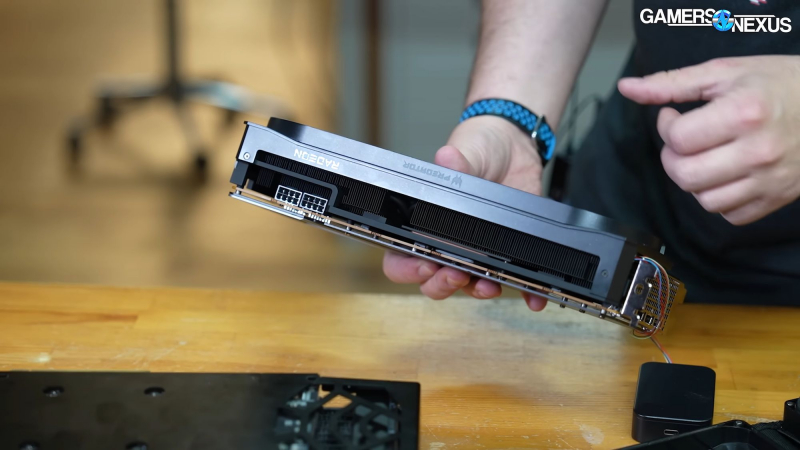 A placa é baseada em uma placa de circuito impresso muito longa e está equipada com dois conectores de alimentação de 8 pinos. Há espaço suficiente ao lado deles para instalar um terço do mesmo. É muito provável que estejamos falando do modelo Radeon RX 7900 XT ou RX 7900 XTX, já que para o Radeon RX 7600 mais jovem lançado recentemente, esse sistema de resfriamento parecerá redundante.
