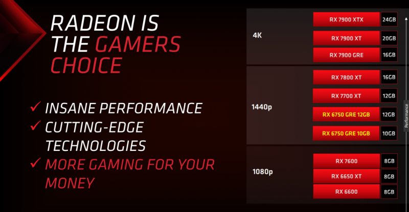 A AMD apresentou oficialmente uma nova placa de vídeo baseada na arquitetura RDNA 2. Estamos falando do modelo Radeon RX 6750 GRE, que estará disponível em duas versões – com 10 e 12 GB de memória. A AMD afirma que ambas as versões do novo produto fornecerão desempenho ideal em jogos com resolução de 1440p.