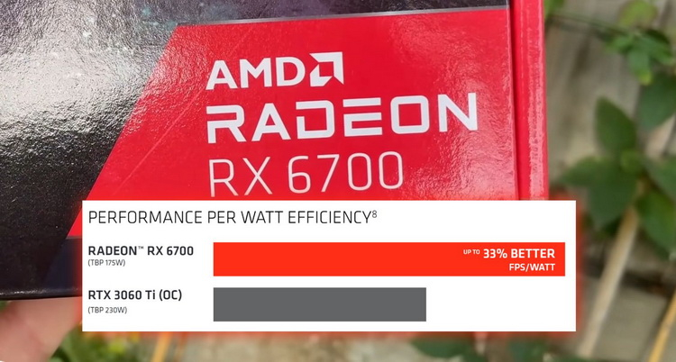 A AMD destaca que a Radeon RX 6700, a 175W, oferece até 33% melhor desempenho por watt do que uma GeForce RTX 3060 Ti com overclock, enquanto ainda oferece o mesmo nível de desempenho.