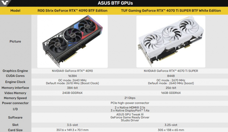 No ano passado, a ASUS lançou uma placa de vídeo exclusiva, a TX Gaming GeForce RTX 4070 BTF, que não possui os conectores de alimentação habituais. Em vez disso, a placa recebeu um conector blade, que substitui os tradicionais conectores de alimentação de 8 ou 12+4 pinos. A ASUS decidiu continuar esta experiência e apresentou os modelos ROG Strix GeForce RTX 4090 BTF e TUF Gaming GeForce RTX 4070 Ti Super BTF com o mesmo recurso. Também foi apresentada uma placa-mãe adequada para os novos produtos.