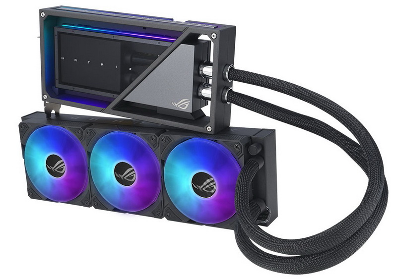 O modelo ASUS ROG Matrix GeForce RTX 4090 Platinum oferece o mais alto overclock de fábrica da GPU e também é equipado com um sistema de refrigeração líquida exclusivo. Inclui um radiador externo com três ventoinhas, um grande bloco de cobre que tem contato com a GPU, chips de memória e elementos do subsistema de energia, além de uma bomba customizada, maior em tamanho que a usada na ASUS ROG GeForce RTX 4090 Strix LC. modelos.