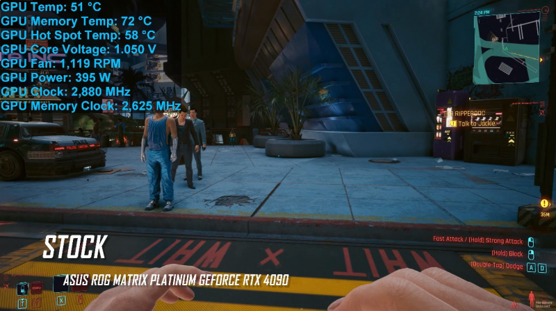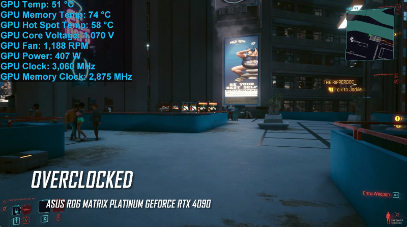 A placa possui um sistema BIOS duplo com modo silencioso e de desempenho. O sistema de refrigeração da ROG Matrix GeForce RTX 4090 Platinum cumpre sua tarefa de forma muito eficaz, como pode ser visto nas imagens abaixo do jogo Cyberpunk 2077 rodando em resolução 4K.