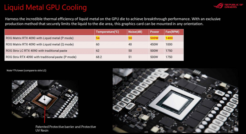 A ASUS se tornou a primeira empresa a decidir usar metal líquido em vez de pasta térmica convencional como interface térmica entre o sistema de resfriamento e o chip gráfico na placa de vídeo para jogos GeForce RTX série 40. Em última análise, a ROG Matrix GeForce RTX 4090 Platinum também é a placa de vídeo para jogos mais rápida do mundo, mas falaremos mais sobre isso a seguir.