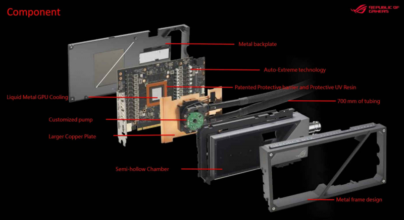 O modelo ASUS ROG Matrix GeForce RTX 4090 Platinum oferece o mais alto overclock de fábrica da GPU e também é equipado com um sistema de refrigeração líquida exclusivo. Inclui um radiador externo com três ventoinhas, um grande bloco de cobre que tem contato com a GPU, chips de memória e elementos do subsistema de energia, além de uma bomba customizada, maior em tamanho que a usada na ASUS ROG GeForce RTX 4090 Strix LC. modelos.