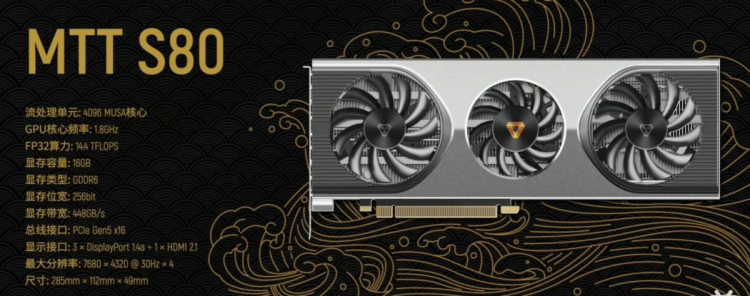 A GPU contém 22 bilhões de transistores. Para o chip da placa de vídeo MTT S80, é indicada a presença de 4960 núcleos gráficos e uma frequência de clock de até 1,8 GHz. A Moore Threads promete desempenho de precisão simples de até 14,4 teraflops para o novo produto. Assim, seu desempenho está teoricamente em algum lugar entre os modelos NVIDIA GeForce RTX 3060 Ti e RTX 3070.