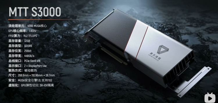 Juntamente com a placa gráfica de jogos MTT S80, a empresa chinesa introduziu um acelerador de computação MTT S3000 especializado com um sistema de refrigeração passivo para racks de servidores. Ela usa o mesmo processador gráfico com o mesmo número de núcleos gráficos do modelo S80, mas a placa profissional dobrou a quantidade de memória de vídeo. São 32 GB aqui.