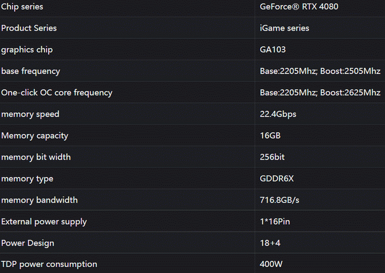 A GPU GeForce RTX 4080 possui 9728 núcleos CUDA. O cartão recebeu 16 GB de memória GDDR6X a uma velocidade de 22,4 Gb/s por pino. A Colorful usa uma placa sem referência para sua versão do acelerador com um subsistema de alimentação VRM de 22 fases reforçado, construído de acordo com o esquema 18 + 4.
