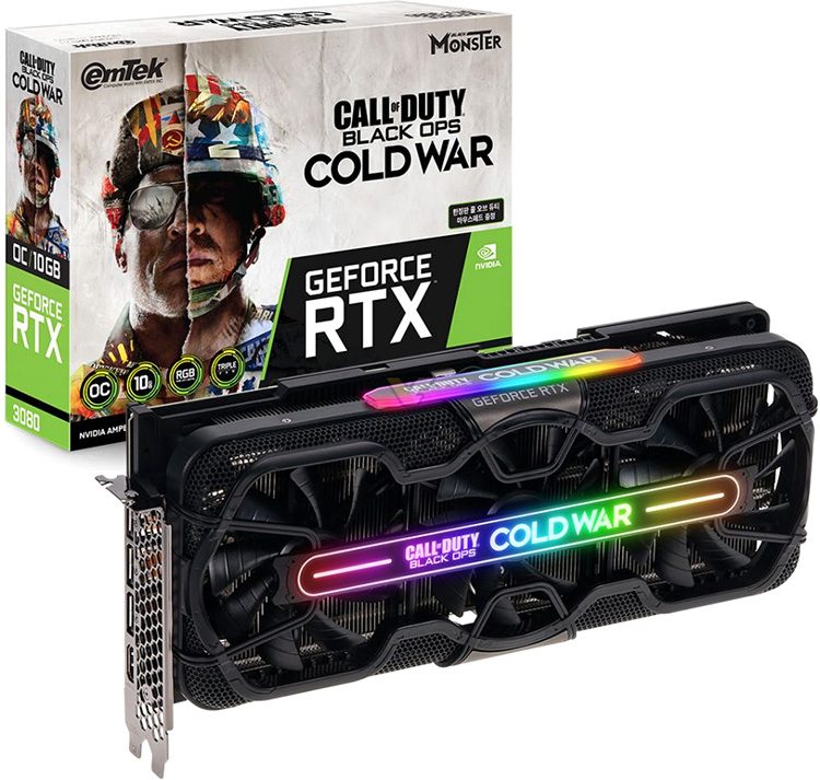 A GeForce RTX 3080 Black Monster COD Edition apresenta uma embalagem diferente, bem como uma nova caixa retroiluminada por LED e painel traseiro no estilo do famoso atirador. A placa de vídeo é baseada no chip gráfico NVIDIA GA102 com 8704 núcleos CUDA e está equipada com 10 GB de memória GDDR6X.