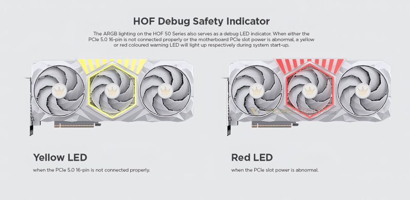 Um recurso notável dos novos produtos é o sistema HOF Debug Safety Indicator, que exibe o estado da placa de vídeo ao inicializar o PC. A retroiluminação amarela e vermelha informa o usuário sobre problemas com a alimentação da placa de vídeo, como instalação incorreta do cabo de alimentação ou problemas com a alimentação através do slot PCIe da placa-mãe.