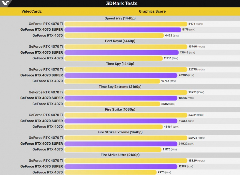 Os testes do novo produto mostram que a GeForce RTX 4070 Super é de 5 a 8% (7% em média) mais lenta que a RTX 4070 Ti e de 15 a 19% (18% em média) mais rápida que a RTX 4070.