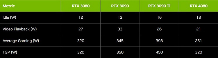 Sob cargas de trabalho típicas, o consumo de energia da GeForce RTX 3080 corresponde aos 320 watts declarados. Por sua vez, para a GeForce RTX 4080, a média é de 251 W, ou 78% do valor declarado, diz a NVIDIA. Também é digno de nota que a GeForce RTX 4080 é significativamente mais produtiva e eficiente em termos de energia do que a principal GeForce RTX 3090 Ti, cujo consumo médio de energia em jogos é de 389 watts com um valor máximo declarado de 450 watts.