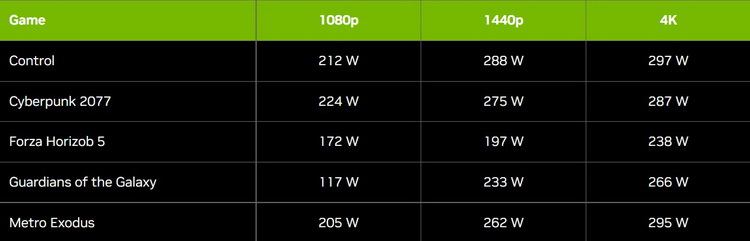 Nos testes de jogo Control, Cyberpunk 2077, Forza Horizon 5 e Guardians of the Galaxy Metro Exodus, usando resolução 4K, ray tracing e dimensionamento DLSS habilitado, o acelerador GeForce RTX 4080 consumiu não mais que 300 watts. O menor consumo é observado na resolução Full HD. Resultados semelhantes são demonstrados por análises independentes da nova placa de vídeo.