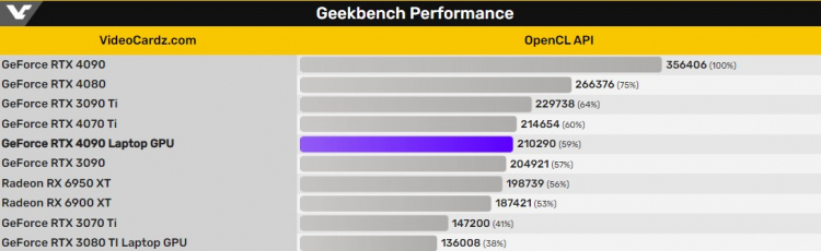 No teste de gráficos OpenCL, a GeForce RTX 4090 móvel é mais rápida que a GeForce RTX 3090 para desktop. Também é 54% mais rápida que a principal GeForce RTX 3080 Ti móvel. É verdade que a versão móvel está 40% atrás da GeForce RTX 4090 para desktop.