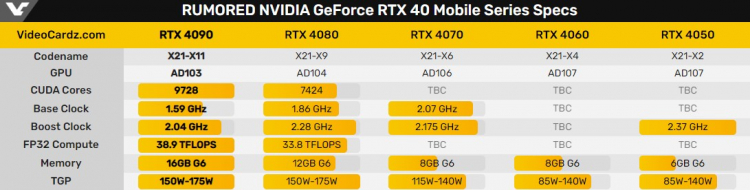 Esses vazamentos revelam as características técnicas do futuro acelerador gráfico móvel. Eles são muito semelhantes aos do modelo de desktop GeForce RTX 4080. Por exemplo, ambos os cartões usam GPUs AD103 com 76 multiprocessadores de streaming, que incluem 9728 núcleos CUDA. A GeForce RTX 4090 móvel, assim como a GeForce RTX 4080 para desktop, possui 16 GB de memória de vídeo. No entanto, ao contrário do último, ele usa memória GDDR6 em vez do GDDR6X mais rápido.