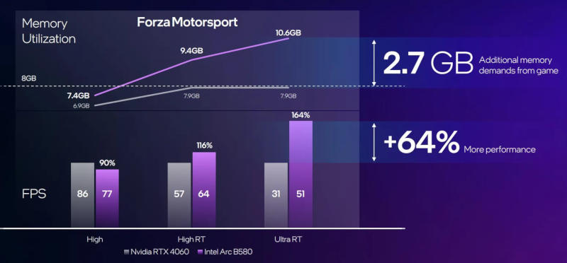 A fabricante oferece claras vantagens em situações em que placas de vídeo concorrentes são limitadas pela capacidade de memória: o Arc B580 possui 12 GB de GDDR6, e a GeForce RTX 4060 possui 8 GB. No Forza Motorsport, a placa de vídeo Nvidia vence a Intel com 86 quadros por segundo contra 77 FPS, mas com o ray tracing habilitado, a Intel vence com 64 quadros por segundo contra 57 FPS. A Intel não forneceu resultados de comparação entre o Arc B570 e a Radeon RX 7600.