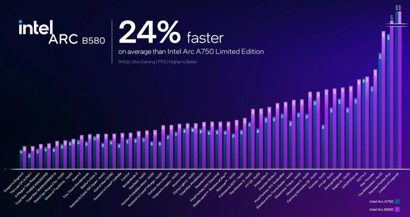 O Arc B580 roda uma ampla gama de jogos mais rápido que o RTX 4060 com resolução de 1440p e configurações de alta qualidade gráfica, afirma o fabricante. O novo produto, emparelhado com o principal processador Intel Core i9-14900K, tem recursos suficientes para ficar acima de 60 quadros por segundo em Cyberpunk 2077, Hogwarts Legacy, Returnal e The Witcher 3, algo que a GeForce RTX 4060 não é capaz.