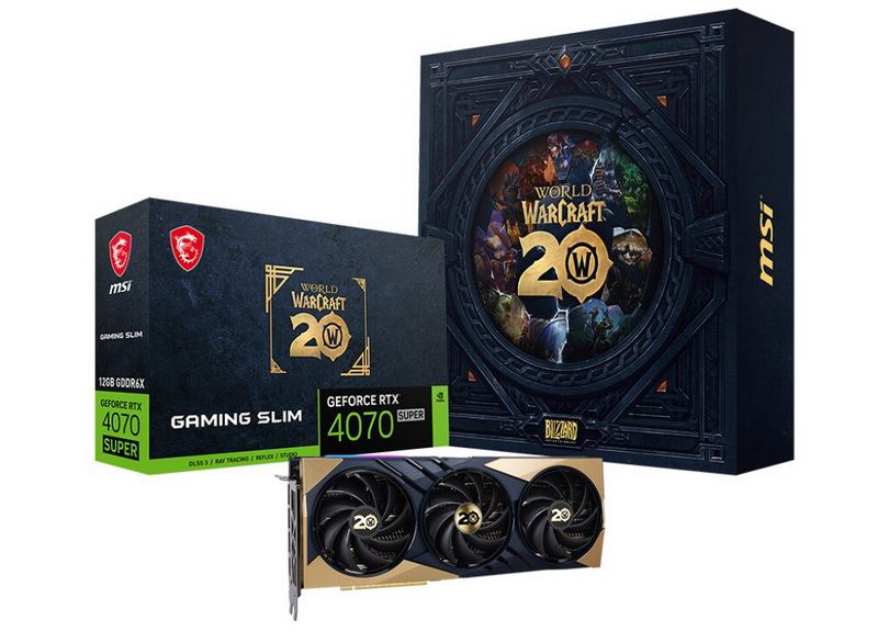 A MSI, em colaboração com a Blizzard Entertainment, apresentou a placa de vídeo GeForce RTX 4070 Super 12G Gaming Slim World of Warcraft Edition. Foi lançado em homenagem ao 20º aniversário do universo de jogos World of Warcraft, bem como por ocasião da nova atualização War Within. O novo produto difere do RTX 4070 Super 12G Gaming Slim regular por seu design exclusivo no estilo do jogo.