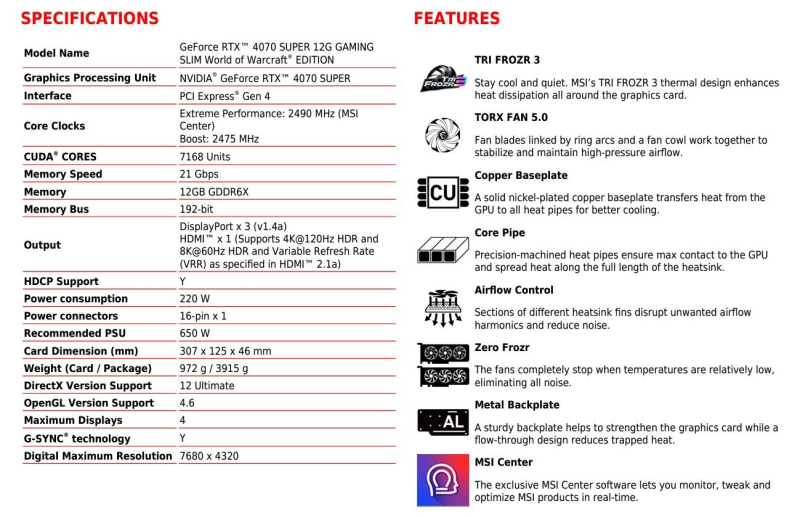 A GeForce RTX 4070 Super 12G Gaming Slim World of Warcraft Edition é alimentada por uma GPU AD104-350 com 7168 núcleos CUDA. O cartão possui 12 GB de memória GDDR6X. Para o novo produto, a GPU vem com overclock de fábrica para 2.490 MHz (disponível no MSI Center). No modo Boost, o chip opera a uma frequência de 2.475 MHz. O TDP declarado é de 220 W.