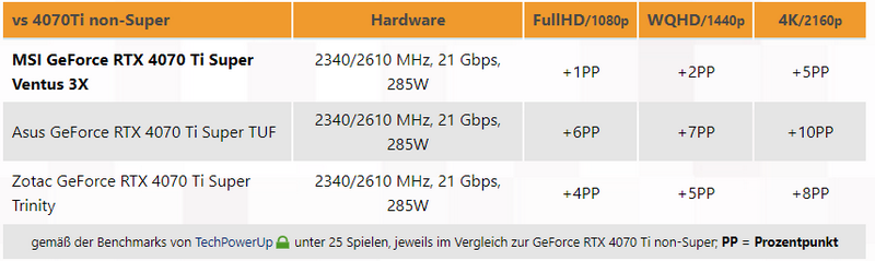 De acordo com o portal Tom’s Hardware, problemas de desempenho com a MSI GeForce RTX 4070 Ti Super Ventus 3X foram observados entre todos os revisores que receberam esta placa para análise. Seu desempenho foi 5% inferior ao esperado. Abaixo estão os dados sobre os ganhos de desempenho de diferentes modelos RTX 4070 Ti Super em relação ao RTX 4070 Ti normal. Todos os cartões possuem especificações padrão. Como você pode ver, o modelo Ventus 3X mostrou claramente o aumento mais fraco no desempenho.
