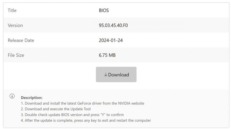 A nova versão do BIOS para RTX 4070 Ti Super da MSI é numerada 95.03.45.40.F0. O tamanho do arquivo é 6,75 MB. O fabricante também forneceu instruções simples e claras sobre como atualizar o BIOS em uma placa de vídeo.