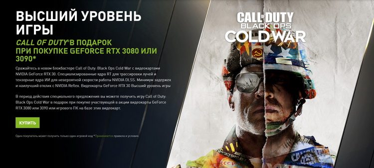 A NVIDIA lançou uma promoção na qual os compradores de placas de vídeo para jogos GeForce RTX 3080 e RTX 3090, bem como computadores com esses aceleradores, poderão receber um código gratuito para baixar o jogo Call of Duty: Black Ops Cold War. A promoção será válida até 10 de dezembro de 2020. Você deve ativar o código recebido antes de 11 de janeiro de 2021. Anteriormente, o fabricante realizou uma campanha semelhante com a participação do jogo Watch Dogs: Legion.