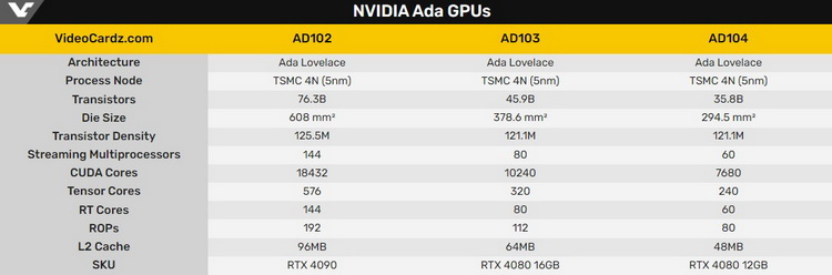 A GPU AD102 tem uma área de matriz de 608mm2 e contém 76,3 bilhões de transistores. Por sua vez, o AD103 possui uma área de matriz de 378,6 mm2, e dentro dele há 45,9 bilhões de transistores. A área do chip do AD104 mais jovem é de 294,5 mm2 e o número de transistores é de 35,8 bilhões. Para comparação, o principal chip gráfico GA102 da geração Ampere tem uma área de628 mm2 e inclui apenas 28,3 bilhões de transistores .