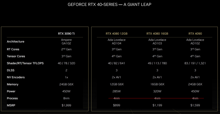 A NVIDIA compartilhou as especificações completas da família de GPUs AD102, AD103 e AD104 Ada Lovelace que servem como as principais placas gráficas para a GeForce RTX 4090, RTX 4080 16GB e RTX 4080 12GB, respectivamente. A empresa também nomeou a área da GPU e o número de transistores que eles possuem.