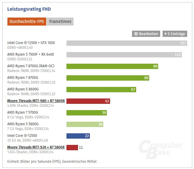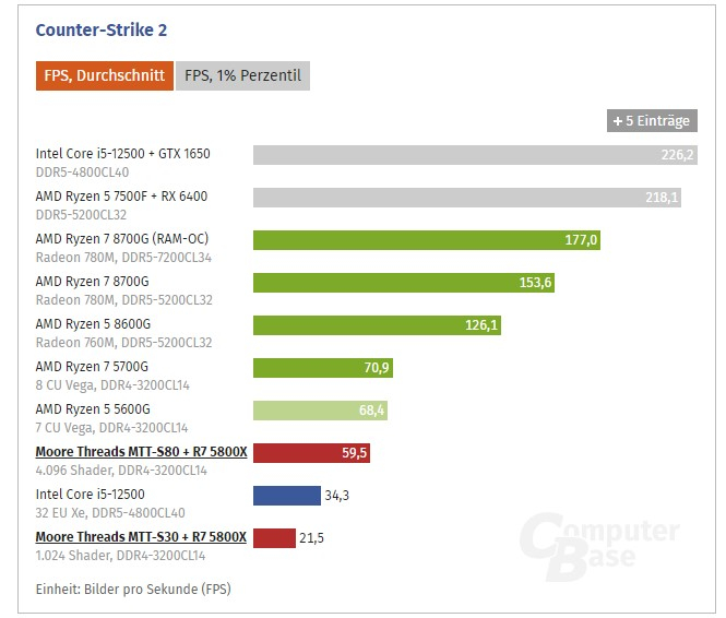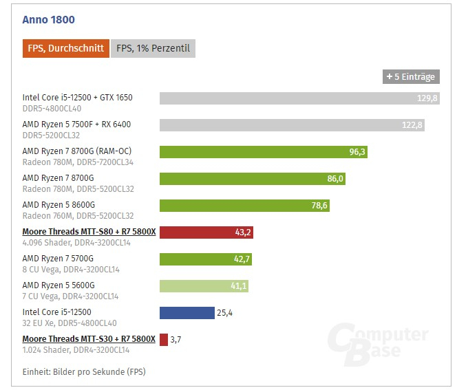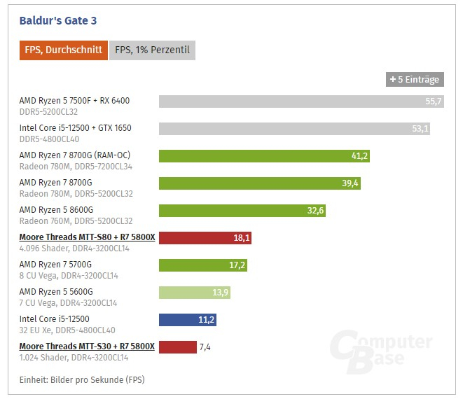 No ano passado, a Moore Threads otimizou significativamente o driver gráfico de suas placas de vídeo. Isso fez com que em testes sintéticos e em alguns jogos o desempenho das placas aumentasse até duas vezes. No entanto, os cartões chineses ainda estão significativamente atrás dos seus concorrentes mais próximos. Além disso, mesmo o modelo carro-chefe MTT S80 tem desempenho pior em jogos do que a placa gráfica integrada Radeon 760M com arquitetura RDNA 3 como parte do processador Ryzen 5 8600G. Isso é evidenciado pelos últimos testes da publicação alemã ComputerBase, que conseguiu colocar as mãos no modelo mais antigo MTT S80, bem como no recentemente lançado MTT S30 de nível básico.