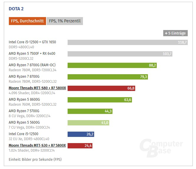 A situação no simulador de planejamento urbano Anno 1800 acabou sendo um pouco melhor. Pelo menos aqui o MTT S80 demonstrou mais de 40 frames por segundo. No entanto, 59,5 FPS para um jogo de tiro tão dinâmico como o Counter-Strike 2, produzido pela placa, claramente não será suficiente. O único jogo em que o MTT S80 teve melhor desempenho que o Ryzen 5 8600G “embutido” foi DOTA 2. Lá, a placa chinesa mostrou 66,8 quadros por segundo, e a solução AMD – 63,6 quadros por segundo.