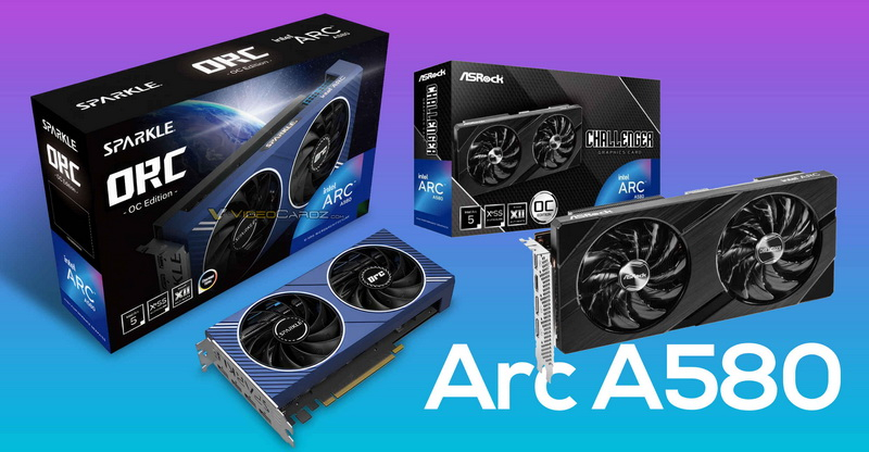 Aparentemente, ASRock e Sparkle prepararam suas próprias versões do Arc A580. No banco de dados do agregador de preços alemão Geizhals, foi descoberto um modelo ASRock Arc A580 Challenger OC com GPU com overclock de fábrica para 2.000 MHz. É equipado com um sistema de resfriamento espesso de três slots, que inclui duas ventoinhas de 100 mm. Provavelmente usa o mesmo PCB do Arc A750 no mesmo design. Assim como o modelo mais antigo, o Arc A580 da ASRock possui dois conectores de 8 pinos para alimentação adicional. No entanto, a placa inferior tem um TDP de 175 W, e não 225 W como o Arc A750. O novo produto também é equipado com uma saída de vídeo HDMI 2.1 e três DisplayPort 2.0.