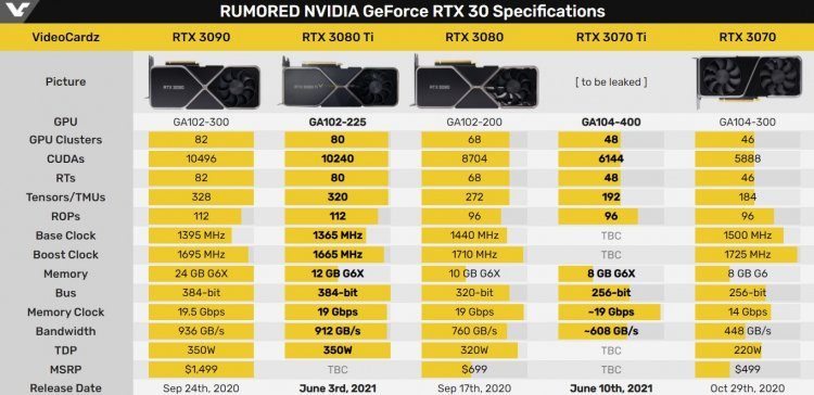 A GeForce RTX 3080 Ti é baseada na GPU GA102-225 com 10.240 núcleos CUDA, bem como 320 tensores e 80 núcleos RT. A frequência de reforço da GPU é de 1665 MHz, que é menor do que a do modelo GeForce RTX 3090, no qual esse número é de 1695 MHz. A novidade está equipada com 12 GB de memória de vídeo GDDR6X com largura de barramento de 384 bits.