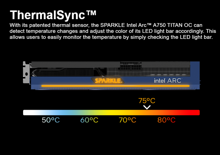 A versão principal do Sparkle Arc A750 Titan OC usa um sistema de refrigeração de dois slots e três ventiladores, enquanto a versão Arc A750 ORC OC usa um design de dois slots e dois ventiladores. Ambas as placas de vídeo são baseadas no chip gráfico ACM-G10 com processadores stream 3584 e possuem 8 GB de memória de vídeo GDDR6 com um barramento de 256 bits. As placas de vídeo têm frequências aumentadas: Sparkle Intel Arc A750 Titan OC opera em até 2300 MHz e Orc OC em até 2200 MHz. Ambos são alimentados por dois conectores de 8 pinos.