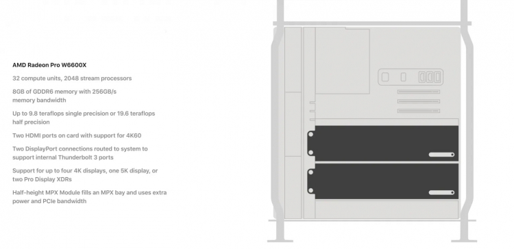 A AMD Radeon Pro W6600X vem equipada com dois conectores HDMI com suporte para saída de imagens 4K a 60 quadros por segundo, além de dois conectores DisplayPort com suporte a Thunderbolt 3. Assim, a novidade permite conectar até quatro telas com resolução de 4K, um com resolução de 5K ou dois monitores Apple Pro Display XDR.