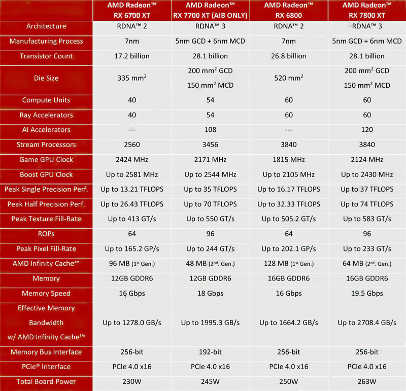 No coração da Radeon RX 7700 XT está a mesma GPU, mas com menos núcleos ativos. O chip possui 54 unidades de execução (3.454 processadores stream). Este modelo de placa de vídeo recebeu 12 GB de memória GDDR6 com suporte para barramento de memória de 192 bits, velocidade de 18 Gb/s por pino e largura de banda de 432 GB/s (1995 GB/s com Infinity Cache).