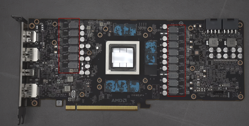O sistema de refrigeração da Radeon RX 7900 GRE no design de referência não é diferente da Radeon RX 7900 XT. O acelerador é equipado com três ventoinhas e um dissipador de calor que ocupa dois slots. Subsistema VRM de 16 fases em estoque com um par de conectores de 8 pinos para alimentação adicional.