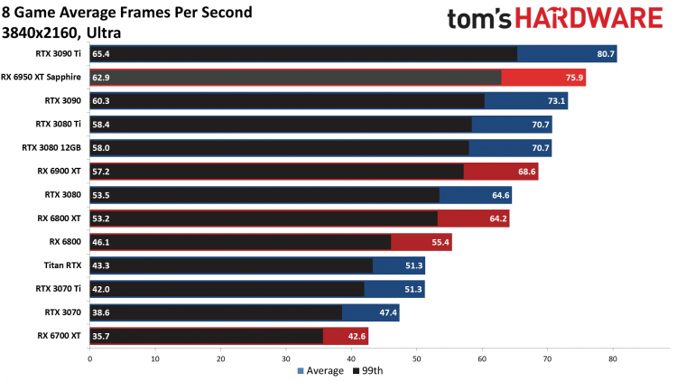 Se falarmos diretamente sobre os concorrentes, então, em média, a Radeon RX 6950 XT é 1-2% mais rápida que o modelo GeForce RTX 3090, mas cerca de 7% mais lenta que a GeForce RTX 3090 Ti. Nesse caso, é claro, estamos falando do desempenho do acelerador em jogos em resolução 4K e nas configurações gráficas máximas.