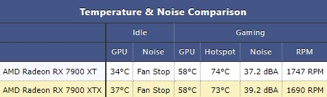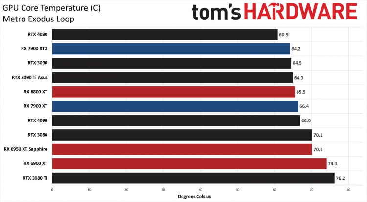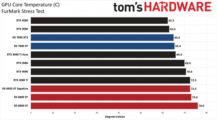 O Tom’s Hardware conseguiu aquecer o chip gráfico do modelo Radeon RX 7900 XTX em jogos de até 64 graus e em um teste de estresse – até 65 graus. O desempenho do modelo Radeon RX 7900 XT foi de 66,4 e 65,4 graus, respectivamente.