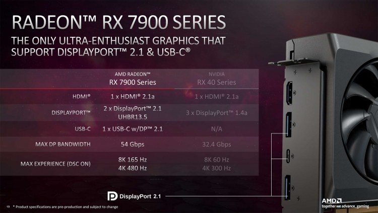 O modelo Radeon RX 7900 XTX recebeu 24 GB de memória GDDR6 a uma velocidade de 20 Gb / s por pino, com suporte para barramento de 384 bits e largura de banda de 960 GB / s, o modelo Radeon RX 7900 XT recebeu 20 GB de Memória GDDR6 com a mesma velocidade, suporte para 320 bits de barramento e largura de banda de 800 GB/s. A melhor placa de vídeo da AMD custa US$ 999. O mais novo é estimado em $ 899.