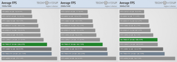 Por sua vez, o modelo Radeon RX 7900 XT demonstrou desempenho ao nível da GeForce RTX 3090 Ti. Ao usar uma resolução baixa, o novo AMD foi significativamente mais rápido do que o principal concorrente da geração anterior. No entanto, com o aumento da resolução para 4K, ambas as placas de vídeo apresentaram o mesmo nível de desempenho, observa o portal TechPowerUp, lembrando que o modelo GeForce RTX 3090 Ti ainda à venda é bem mais caro que o recém-chegado.