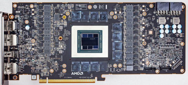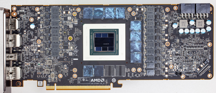Placa de circuito Radeon RX 7900 XT de referência (vista frontal). Fonte da imagem: TechPowerUp