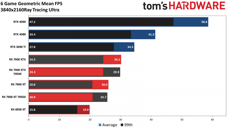 Porém, de acordo com a Tom’s Hardware, as placas de vídeo AMD de nova geração ainda carecem de agilidade para igualar o desempenho RT da mesma GeForce RTX 4080, sem contar a GeForce RTX 4090. Desta última, a mais antiga Radeon RX 7900 XTX sem o uso de escala de tecnologia (NVIDIA DLSS, AMD FSR) está quase duas vezes atrás, e o modelo Radeon RX 7900 XT está mais que o dobro (diferença de 125%).