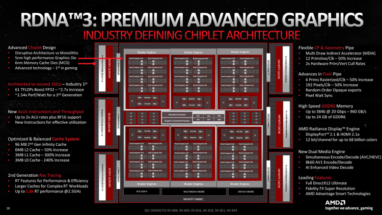 Lembre-se de que as Radeon RX 7900 XTX e RX 7900 XT são baseadas em GPUs Navi 31 baseadas na arquitetura RDNA 3, que pela primeira vez para uma GPU usam o chamado design chiplet, ou seja, consistem em vários cristais. A matriz principal GCD (Graphics Compute Die) da GPU contém processadores de fluxo e outros blocos, e é baseada na tecnologia de processo TSMC N5 (5 nm). Os cristais auxiliares MCD (Memory Cache Die) na tecnologia de processo TSMC N6 (6 nm) são responsáveis pela memória cache.
