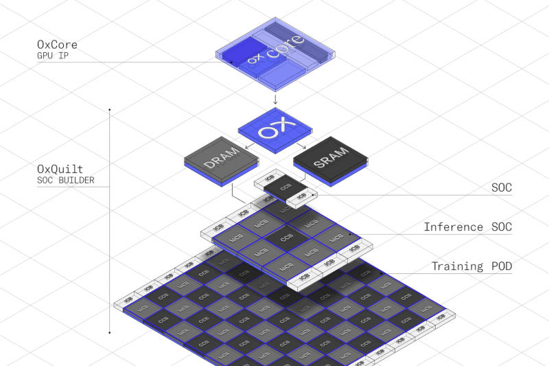 A tecnologia de GPU da Oxmiq pode ser dimensionada de um único núcleo OXCore para sistemas robóticos a milhares de núcleos para aceleradores de IA em data centers de provedores de nuvem. Isso é possível por meio da tecnologia chiplet OXQuilt. Além disso, a arquitetura pode ser adaptada a tipos específicos de computação, afirmou a empresa.