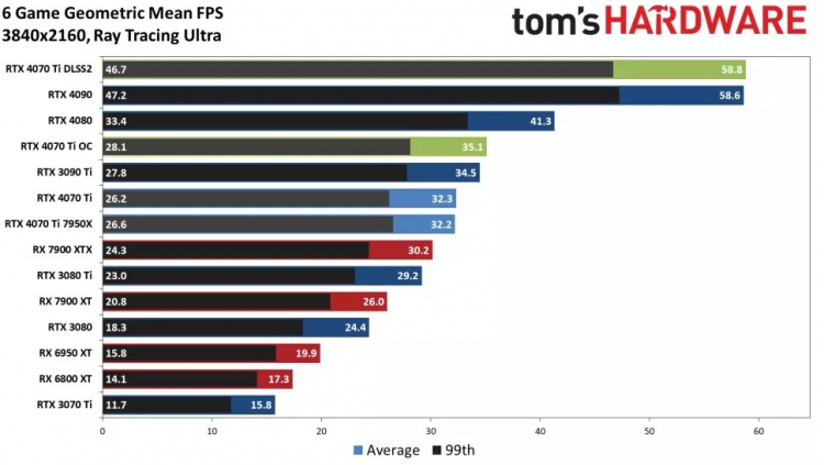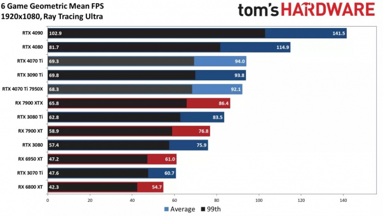 Além disso, a GeForce RTX 4070 Ti acabou sendo mais fraca do que a Radeon RX 7900 XT sem ray tracing, mas com ela ultrapassou com confiança não apenas este concorrente, mas até mesmo o carro-chefe Radeon RX 7900 XTX.