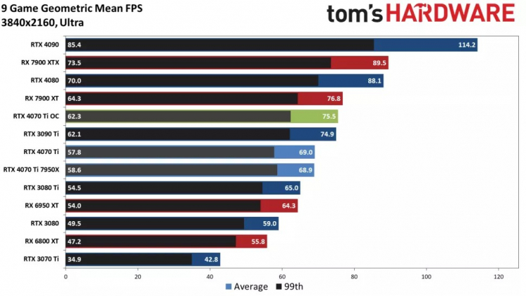 A Tom’s Hardware testou a placa de vídeo ASUS GeForce RTX 4070 Ti TUF Gaming OC, que possui um leve overclock de fábrica (2760 MHz). Em testes de jogos com resolução de 1080p (1920 × 1080 pixels), a placa foi em média um pouco mais rápida que o carro-chefe da geração anterior diante da GeForce RTX 3090 Ti. Ao mesmo tempo, a própria NVIDIA afirmou que o novo produto é “até 1,8 vezes mais rápido que o antigo carro-chefe”. Mas, na realidade, eles geralmente são os mesmos.