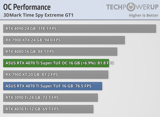 A GeForce RTX 4070 Ti Super tem o potencial de overclock esperado. As configurações manuais podem aumentar seu desempenho em 6–7% em relação ao valor nominal, escreve TechPowerUp. Quanto à reserva de energia, a versão ASUS da placa permite aumentá-la de 285 para 300 W.