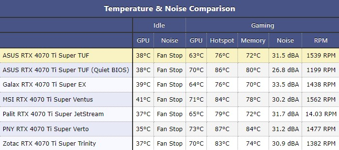 A ASUS GeForce RTX 4070 Ti Super TUF testada está equipada com um dos sistemas de refrigeração mais eficientes. É composto por três ventiladores. Como observa o portal TechPowerUp, sob carga a GPU da placa de vídeo aqueceu apenas até 63 graus Celsius. No ponto mais quente (Hotspot) da placa de vídeo, a temperatura era de 76 graus. E a memória do cartão aqueceu até 72 graus. O ruído do ventilador era de cerca de 31 dBA. Ao mudar para o modo silencioso do BIOS, a temperatura da placa era de 70, 86 e 80 graus Celsius para GPU, Hotspot e memória, respectivamente. O nível de ruído diminuiu para 26,8 dBA. Tom’s Hardware fornece números semelhantes.