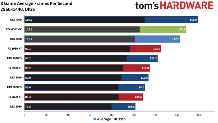 Em comparação com as placas gráficas AMD, a GeForce RTX 4080 foi 29% mais rápida que a Radeon RX 6950 XT nos testes de jogos Tom’s Hardware. Portanto, se as declarações da AMD sobre a superioridade da Radeon RX 7900 XTX sobre seu antecessor em 50-70% forem verdadeiras, a GeForce RTX 4080 poderá enfrentar sérias dificuldades no próximo mês.