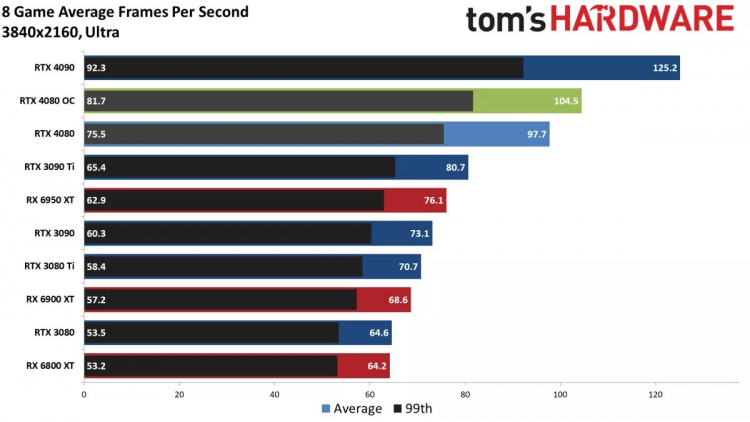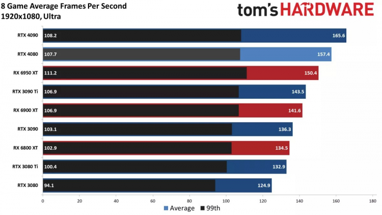 Em comparação com as placas gráficas AMD, a GeForce RTX 4080 foi 29% mais rápida que a Radeon RX 6950 XT nos testes de jogos Tom’s Hardware. Portanto, se as declarações da AMD sobre a superioridade da Radeon RX 7900 XTX sobre seu antecessor em 50-70% forem verdadeiras, a GeForce RTX 4080 poderá enfrentar sérias dificuldades no próximo mês.