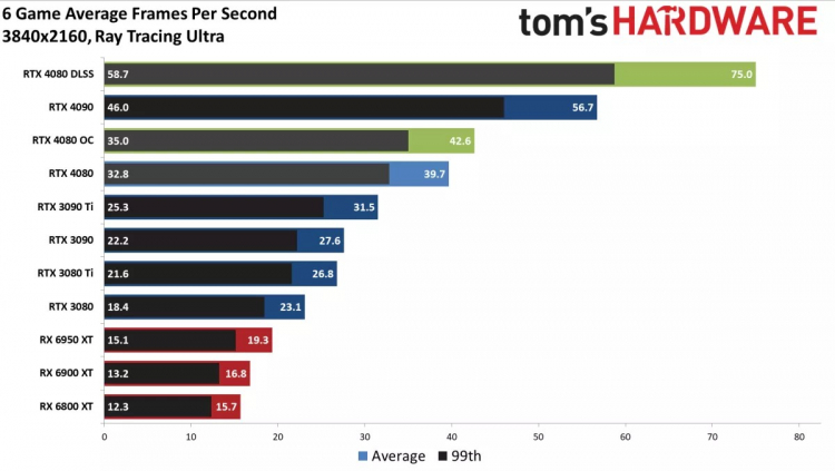 Em jogos ray-traced, a GeForce RTX 4080 tem um desempenho muito bom, o que não surpreende. É 26% mais rápido que o RTX 3090 Ti, 72% mais rápido que o RTX 3080 e mais que o dobro do RX 6950 XT. E a ativação do DLSS permite fornecer velocidade ainda maior – com ele, o novo produto pode ultrapassar o RTX 4090 se você não ativar o DLSS no último.